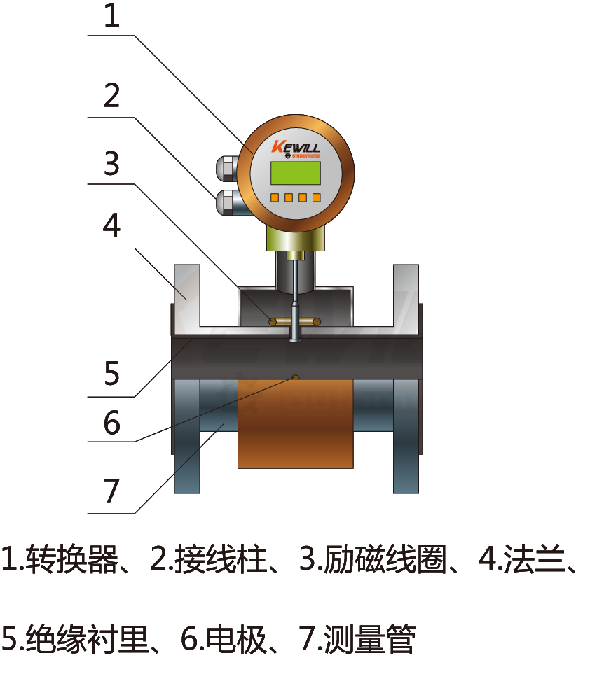 測量流量時,導(dǎo)電性液體以速度V流過垂直于流量方向的磁場,導(dǎo)電性液體的流動感應(yīng)出一個與平均流速成正比的電壓,其感應(yīng)電壓信號通過二個或二個以上與液體直接接觸的感應(yīng)電極檢出,并通過電纜送至轉(zhuǎn)換器通過其智能化處理,實現(xiàn)流體瞬時流量、積累流量的顯示及流量數(shù)據(jù)與控制系統(tǒng)之間的通訊。測量管內(nèi)無活動及阻流部件,因此幾乎沒有壓力損失,并且有很高的可靠性。