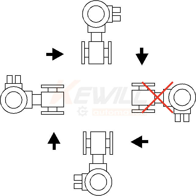 為了在不同的應用條件下確保說明書所表述的精度,安裝傳感器時應從電極面上游安裝五倍管徑的直管段,下游安裝三倍管徑的直管段,見下圖所示。這種安裝可以充分排出由于彎管、閥門或縮頸引起的干擾。當流量計前后的直管段不能滿足要求時,性能指標會有一定偏差。